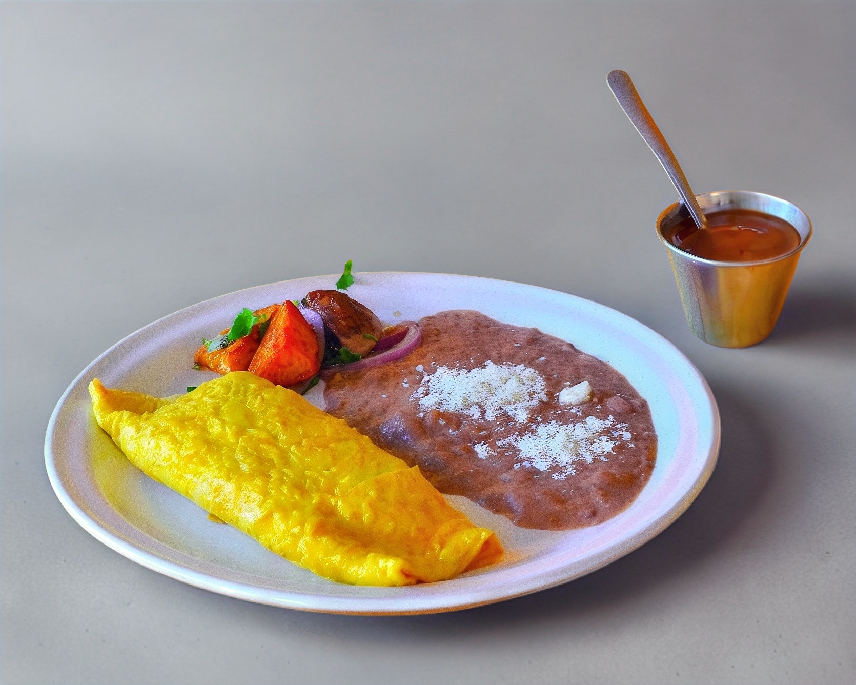 Omelette con jitomate, chile serrano, cebolla, salsa mexicana, queso mozarella, acompañados de frijoles y queso de la casa.