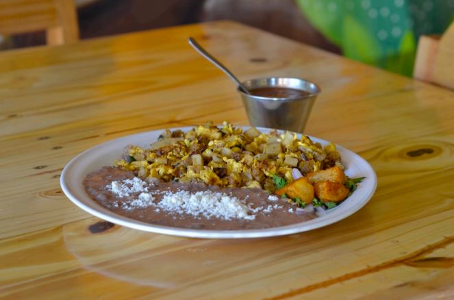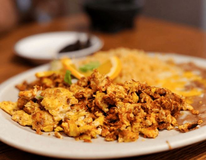 Huevos revueltos con chorizo, acompañados de frijoles y queso de la casa.