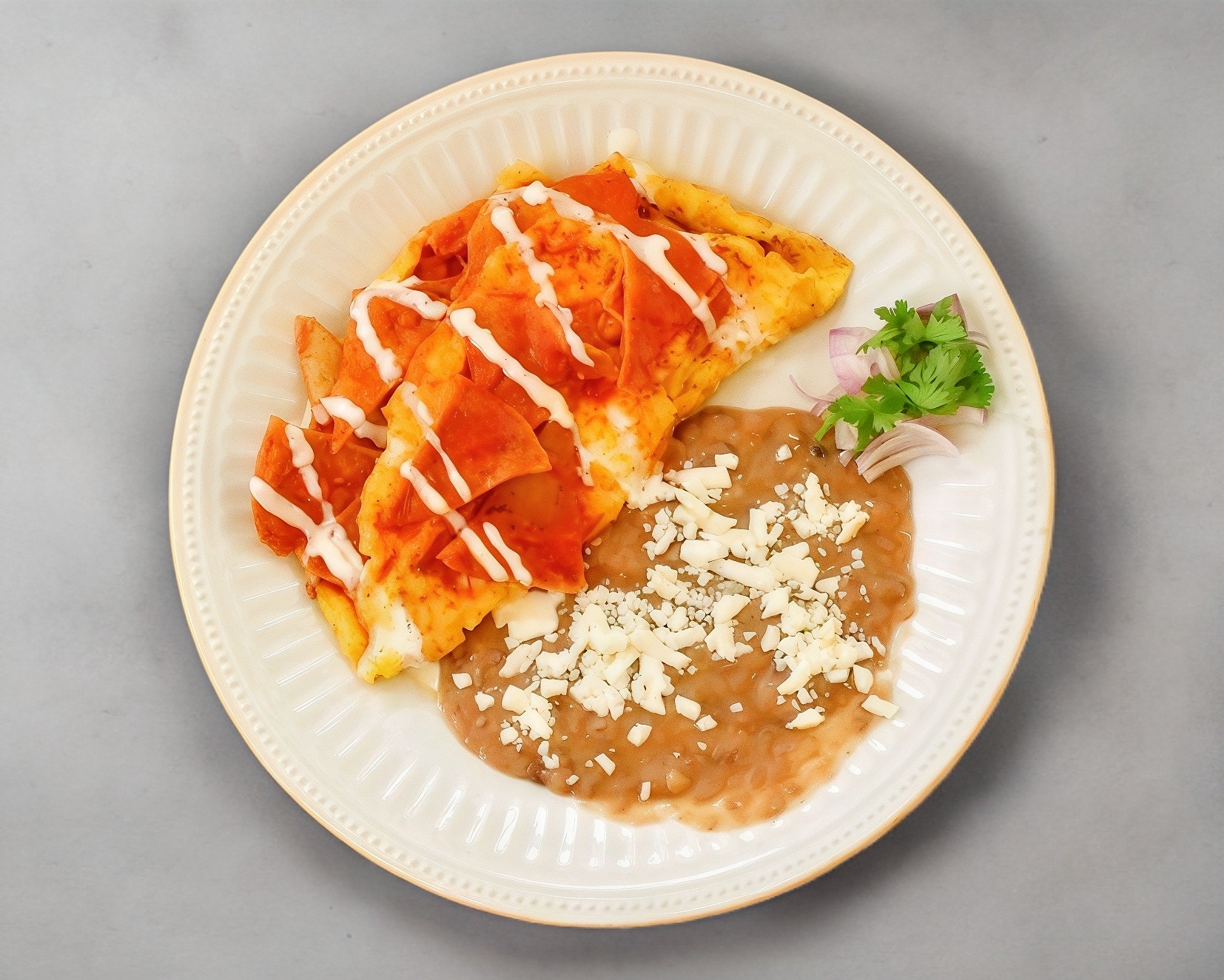 Totopos de maíz bañados en salsa roja, con huevo, acompañados de frijoles y queso de la casa.