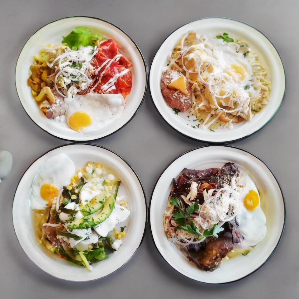Omelette, chicharrón en salsa roja o verde, frijol refrito y queso panela.