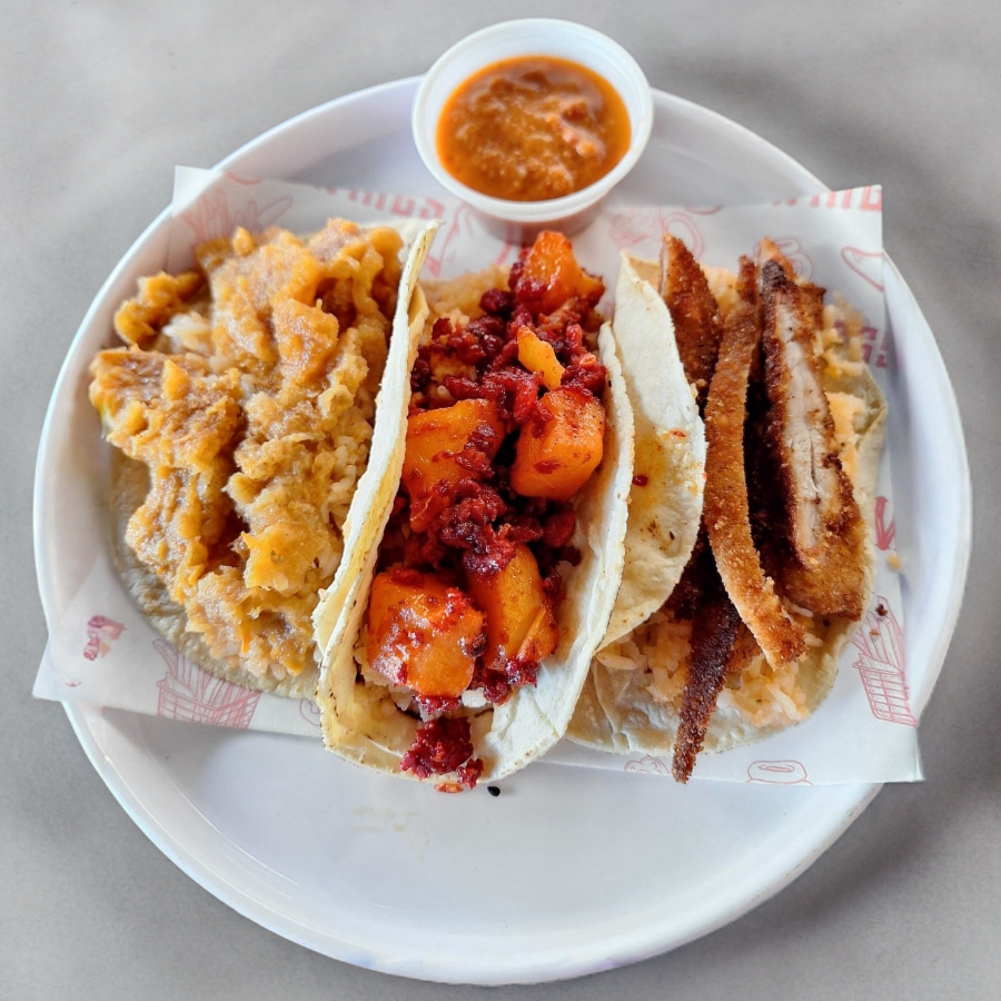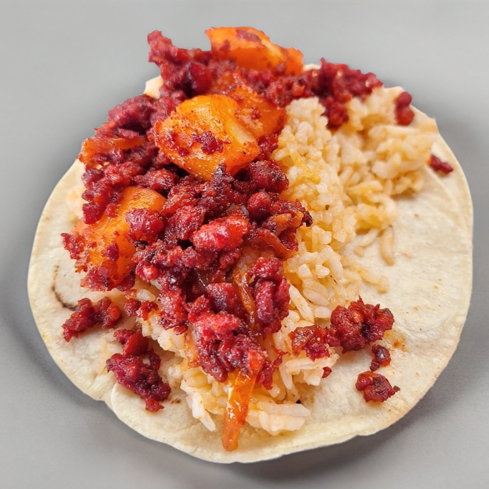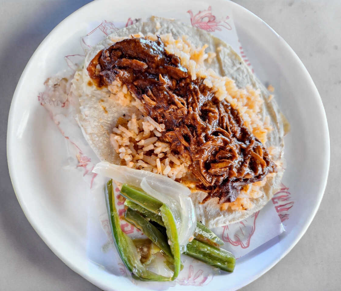 Taco de chuleta ahumada con arroz y frijoles.