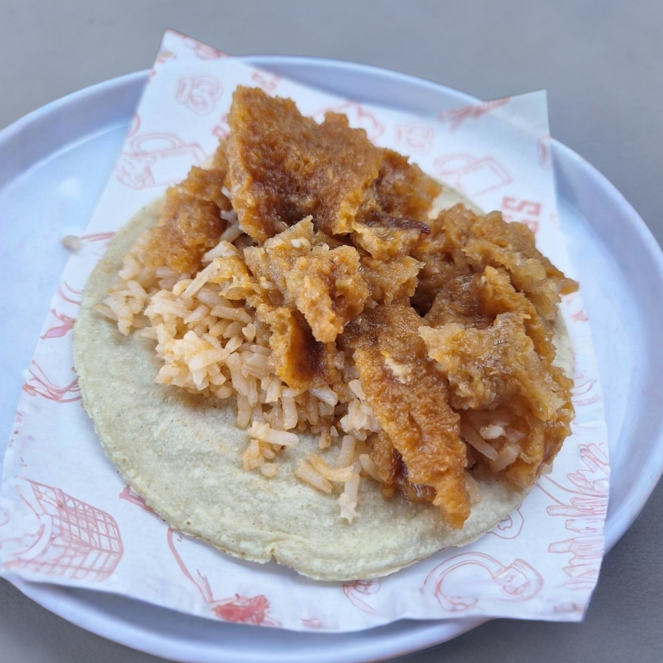 Taco de milanesa empanizada, con arroz (doble tortilla de maíz).