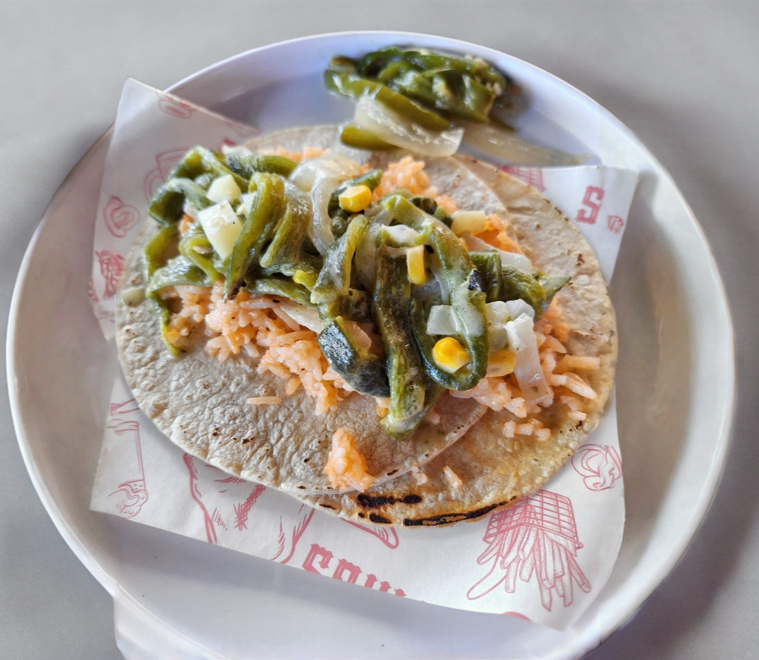 Taco de deliciosas rajas con crema, pollo y arroz, (doble tortilla de maíz normal).