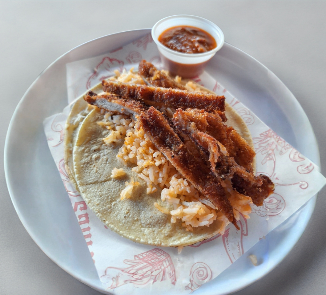 Taco Grande de Chicharrón en Salsa con Arroz