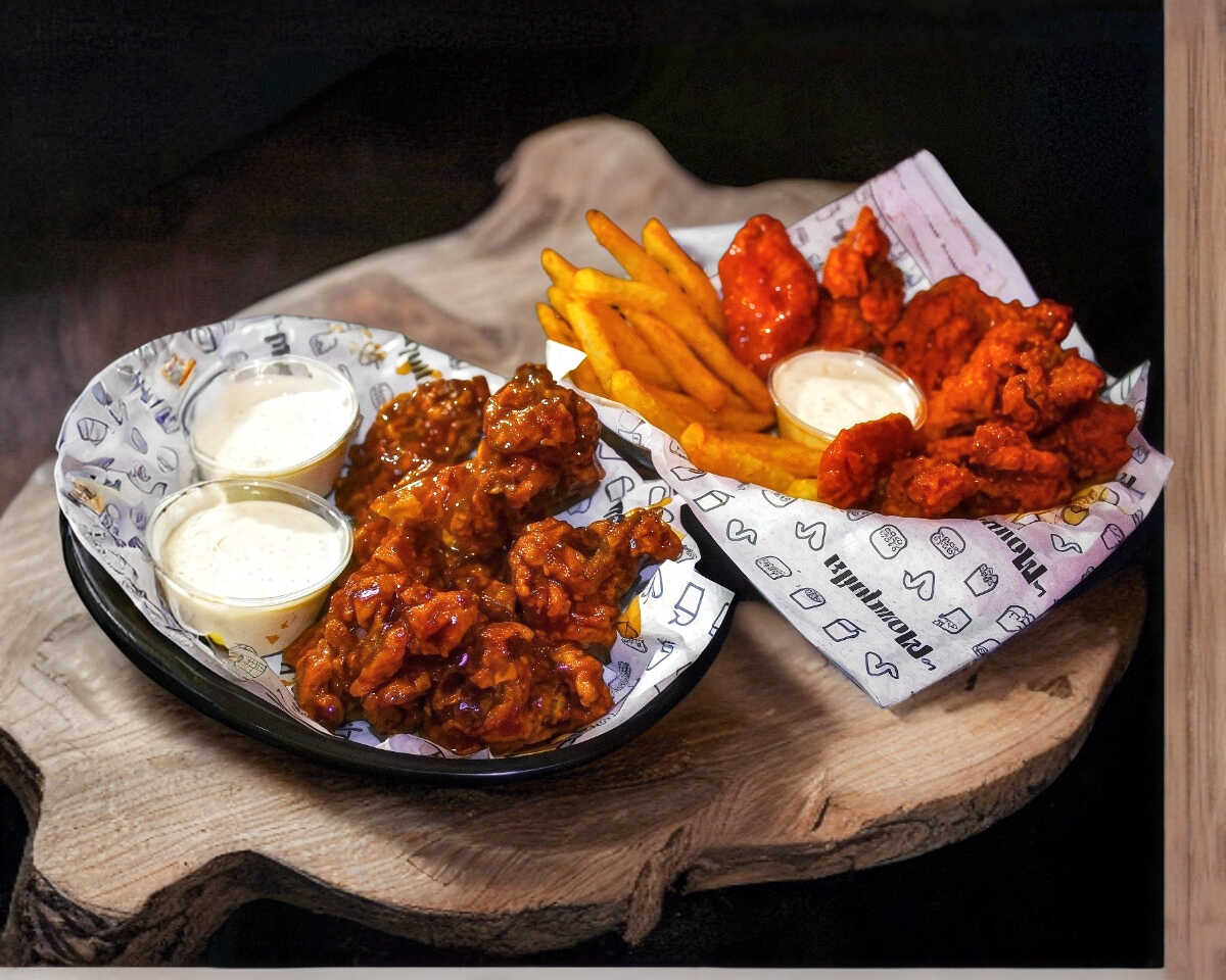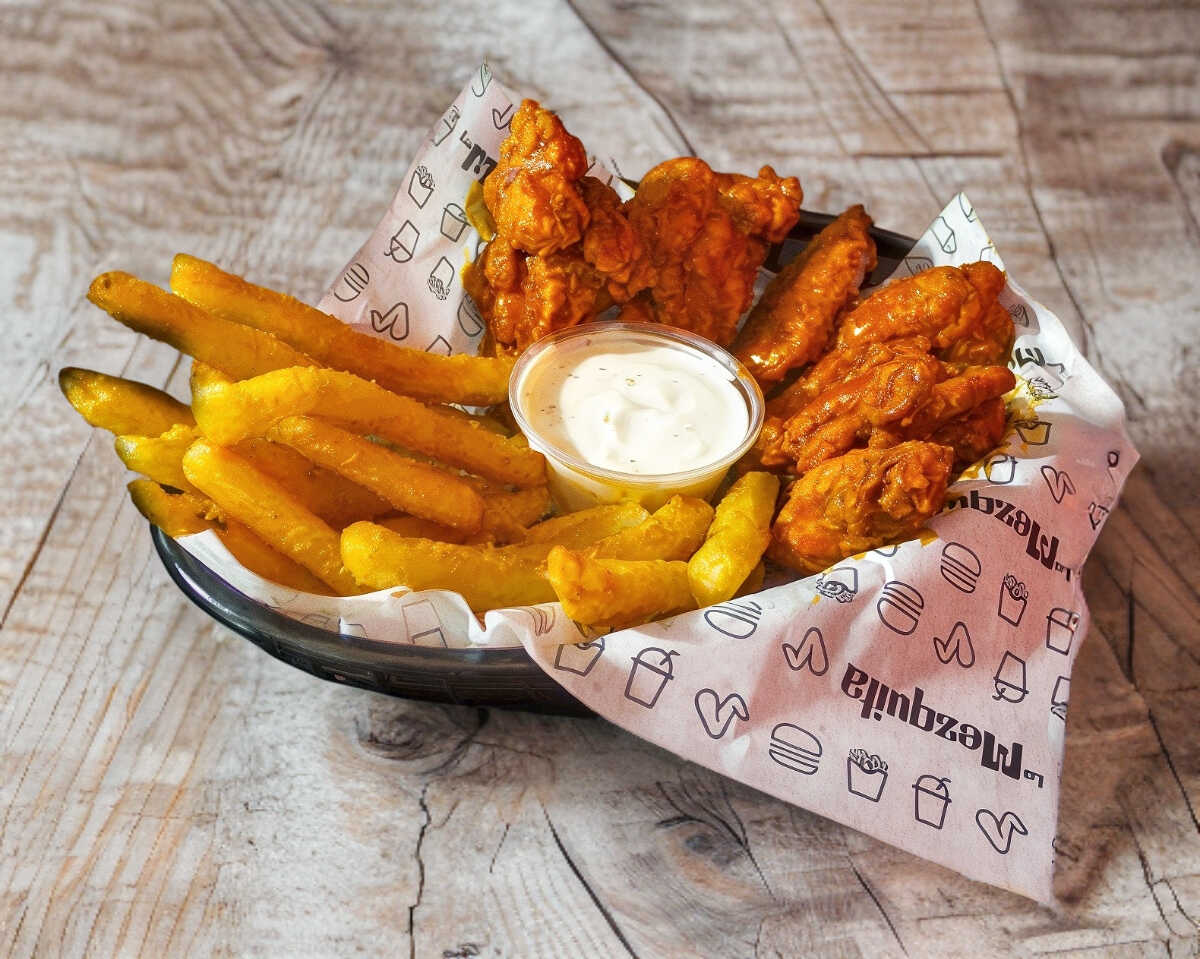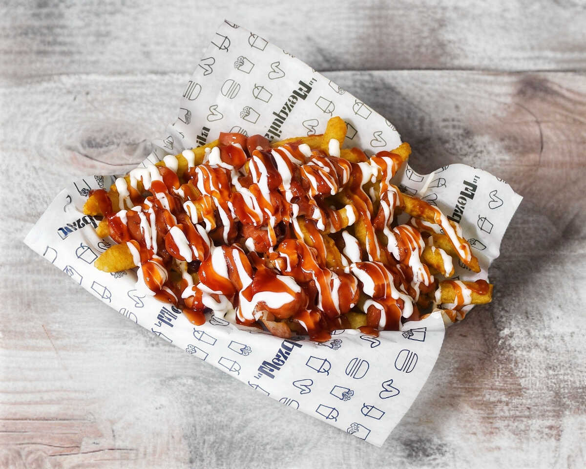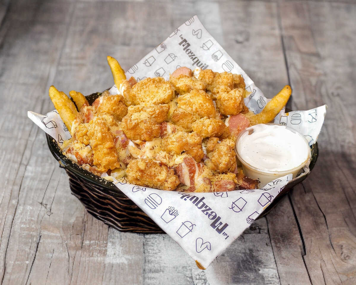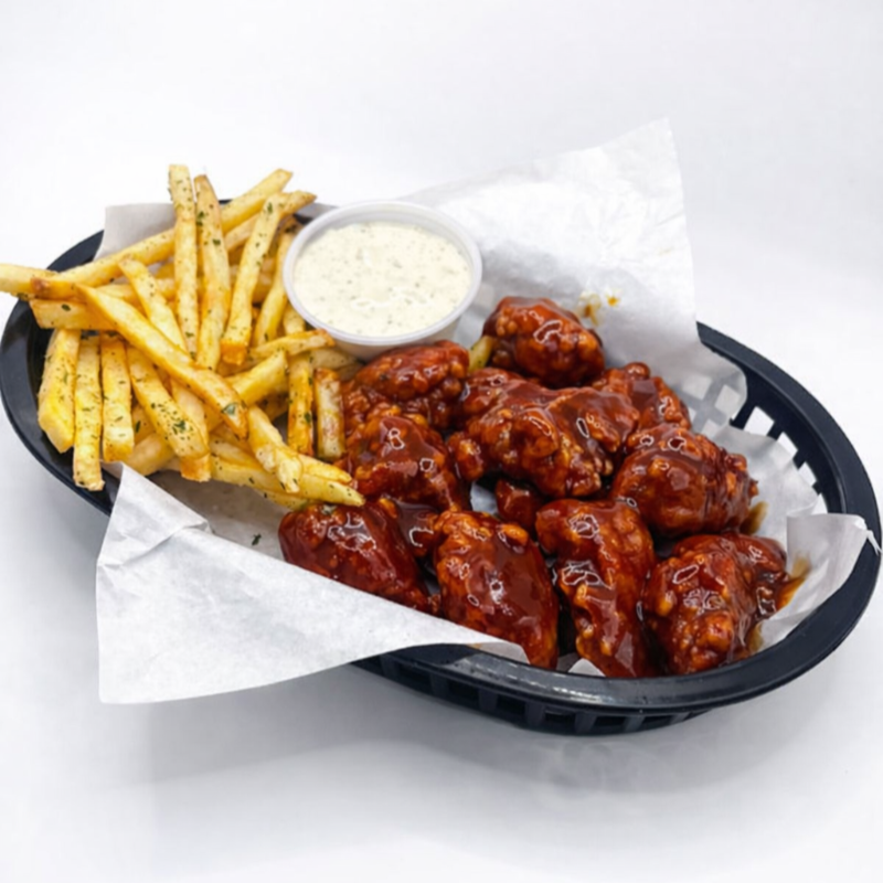 Papas fritas a la francesa + 2 salchichas con tocino + boneless bañados con salsa de su elección + crema, cátsup y 1 aderezo ranch.