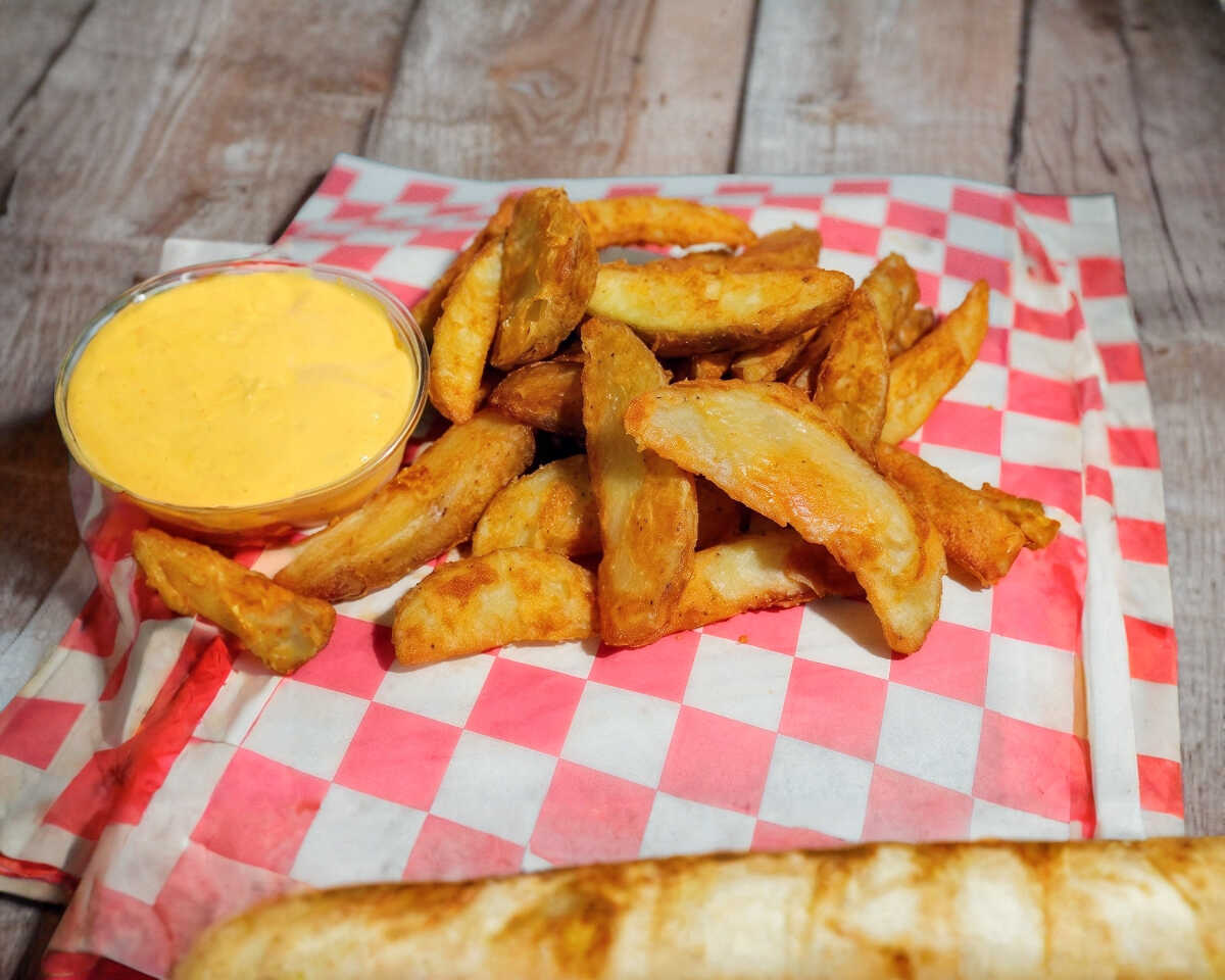 300 Gramos de papas fritas sazonadas en gajo.+ 1 aderezo ranch + catsup