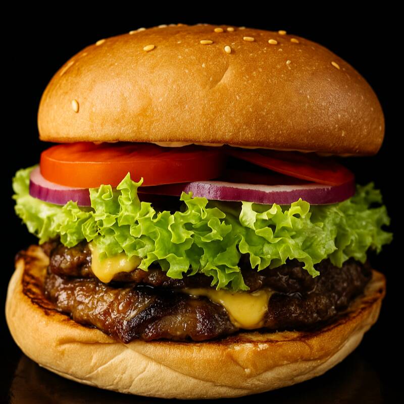 150 Grs. de carne de res, queso americano, lechuga tomate, cebolla, aderezp de la casa y crema.