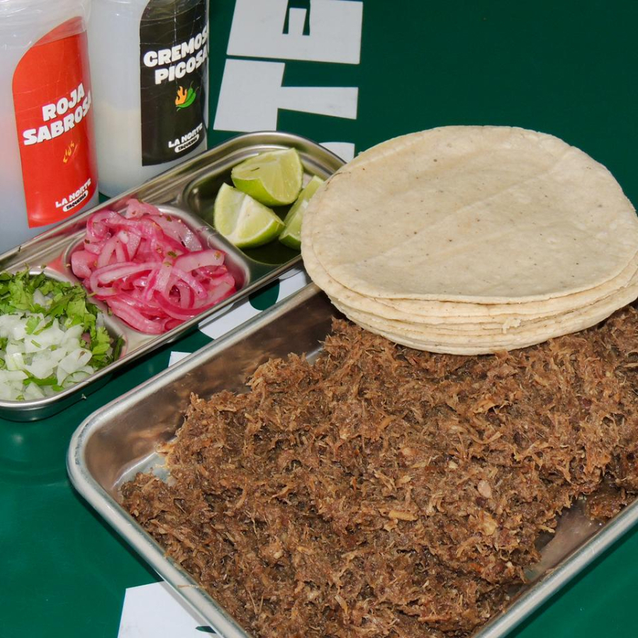 Deliciosa barbacoa de res acompañada de tortillas mixtas, salsas y verdura