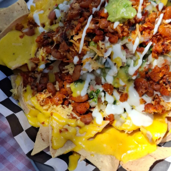 Totopos fritos de la casa bañados con queso amarillo líquido de papa, chorizo de soya, seitán soya, frijoles de olla, pico de gallo, guacamole, crema y chiles jalapeños.