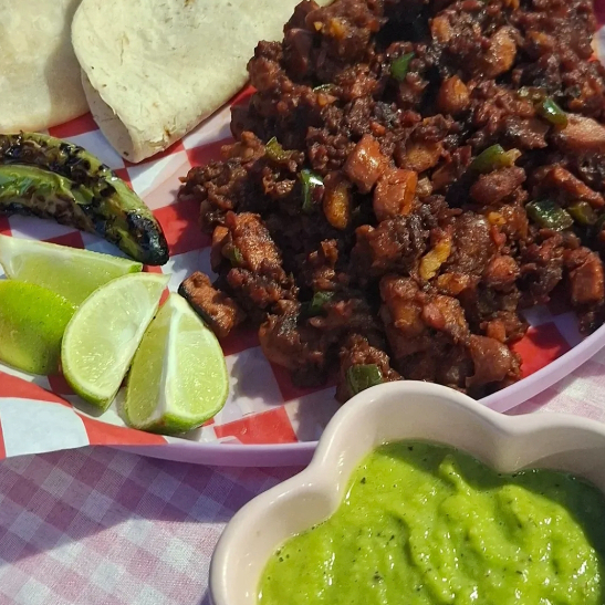Guiso de seitán asado, chorizo de soya, salchicha de proteína de chicharo, frijoles de olla, tomate, cebolla y cilantro. Incluye guacamole, salsa, limones, chiles y tortillas de maíz para 4 a 5 tacos.