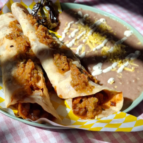 Orden de 3 burritos de proteína vegetal a elegir, se acompañan con cebolla, cilantro, crema, salasa y chiles. Invluye frijoles.