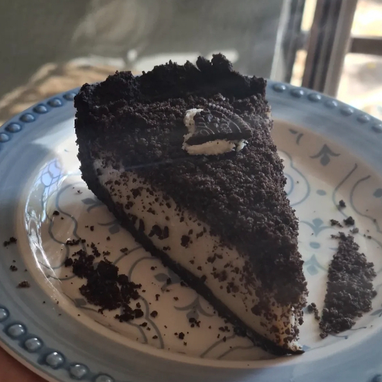 Rebanada de cheesecake de oreo, a base de tofu.