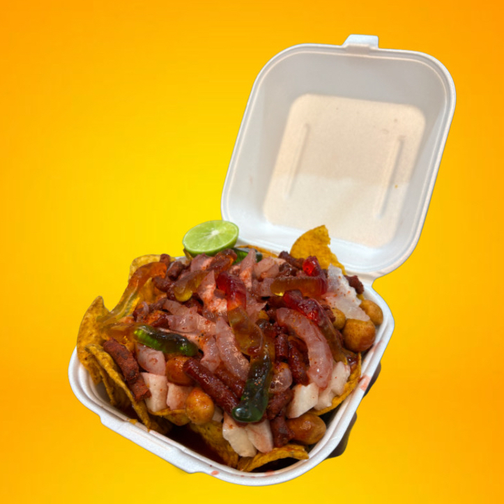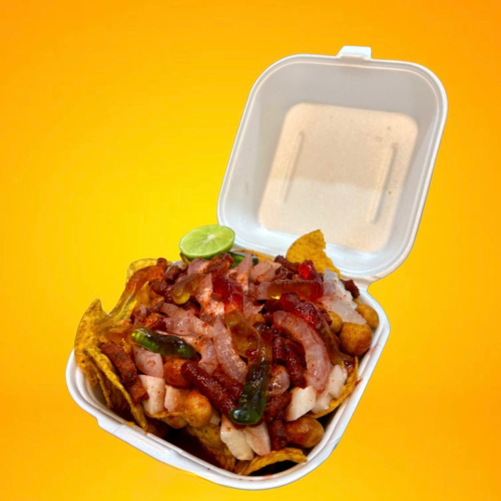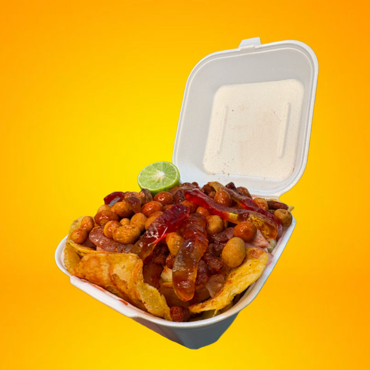 Chips de jalapeño con jícama, pepino, cueritos, rielitos, cacahuates japoneses y gomitas, bañados con un toque de clamato, Tajín y Miguelito.
