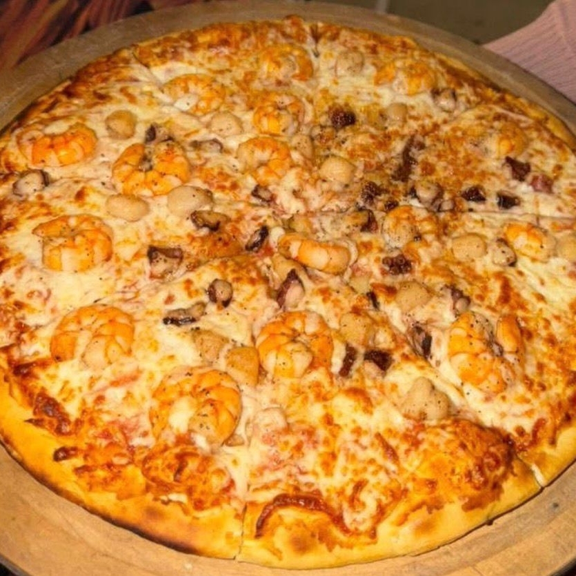 Salsa de tomate, queso mozzarella, pulpo, callo y camarones salteados. La joya del mar ofrecida al fuego de la tribu.