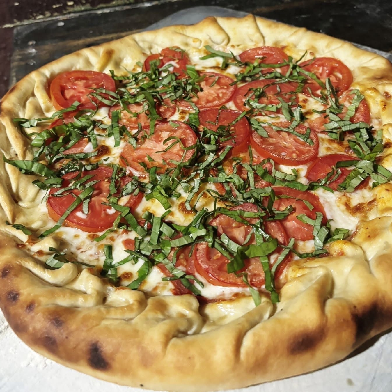 Salsa de jitomate, queso mozzarella fresco, rodajas de jitomate y albahaca. La pureza italiana con el poder de la leña.