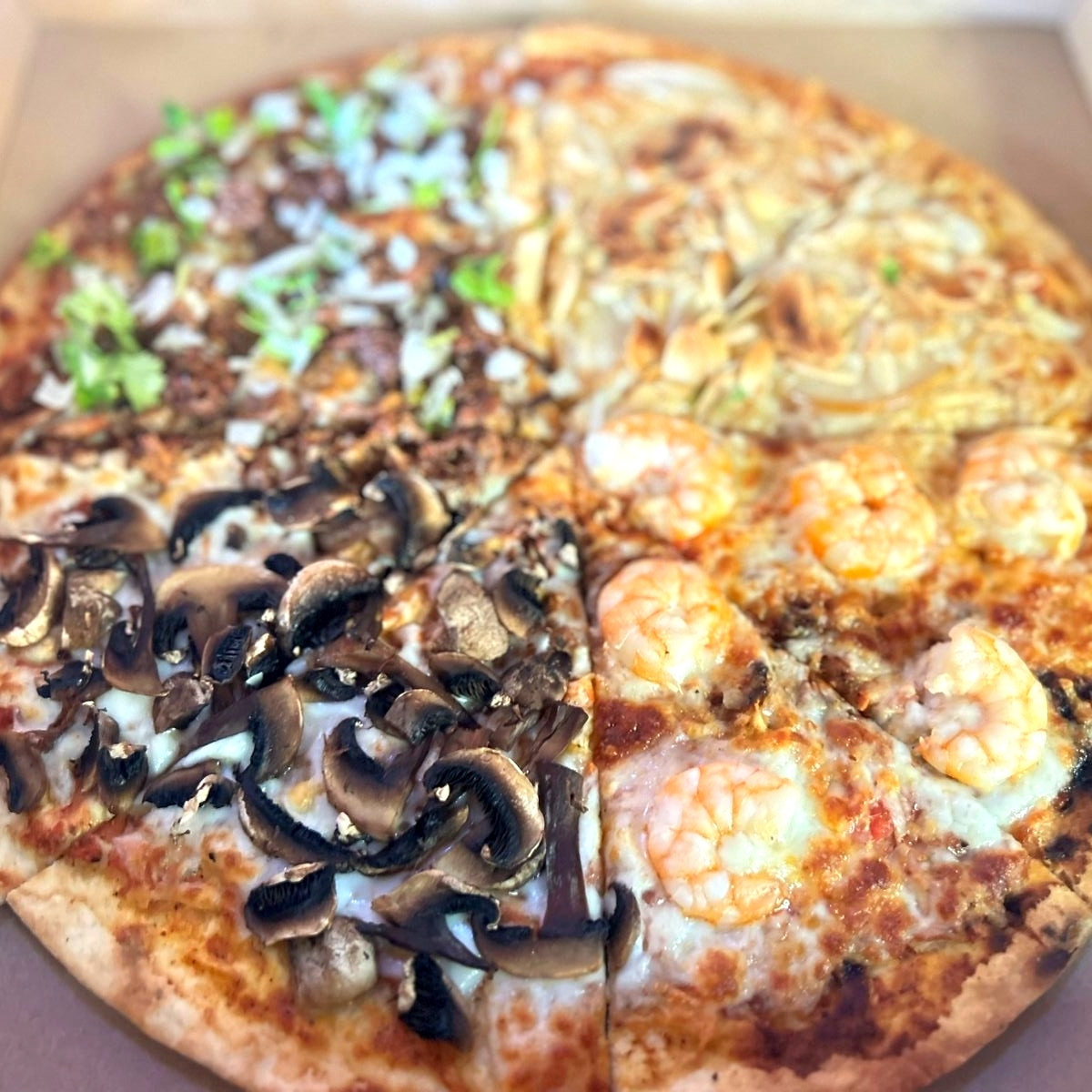 Champiñón, salami, pimientos salteados y cebolla blanca salteada.