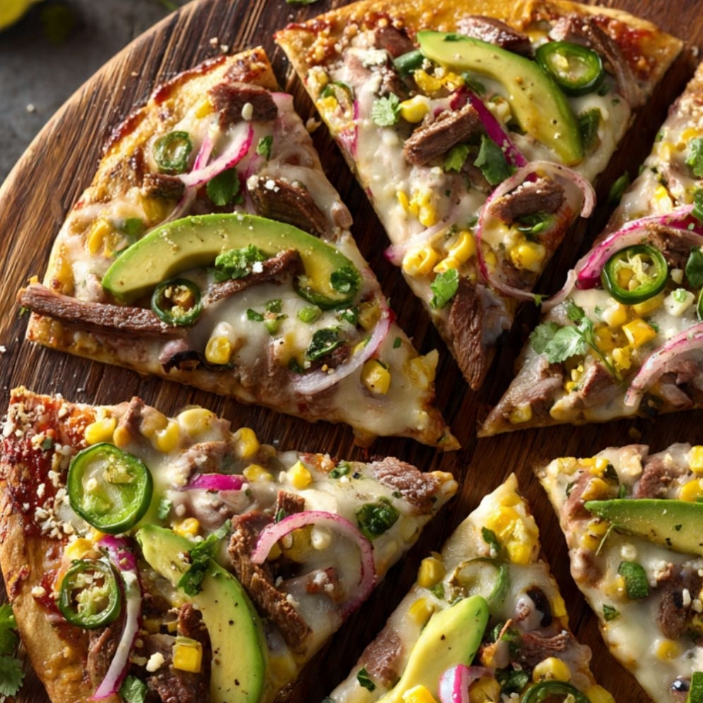 Base de frijoles refritos, carne asada al carbón, cebolla morada asada, jalapeños, elote, aguacate fresco y queso gratinado. Es como comerte un taco callejero pero elevado al nivel de pizza.