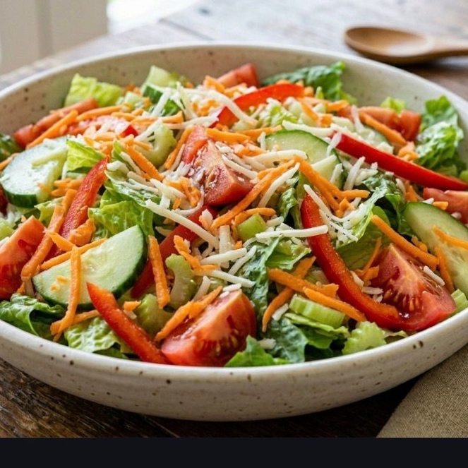 Lechuga, apio, jitomate, pepino, zanahoria, morrón fresco, mozzarella y aderezo de la casa. Un festín de colores para la tribu