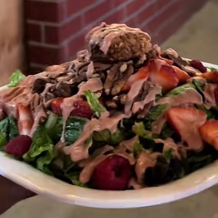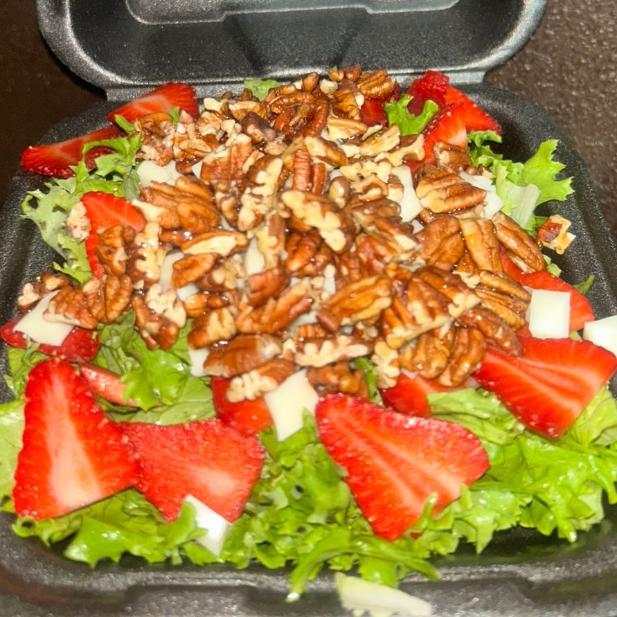 Lechuga fresca con fresas, nueces caramelizadas y queso de cabra o panela. El equilibrio perfecto entre lo fresco, lo dulce y lo crujiente
