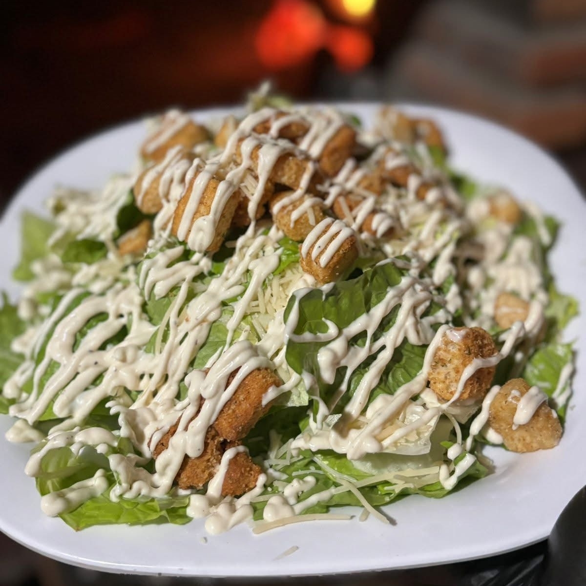 Lechuga romana, aderezo César, crotones y parmesano rallado