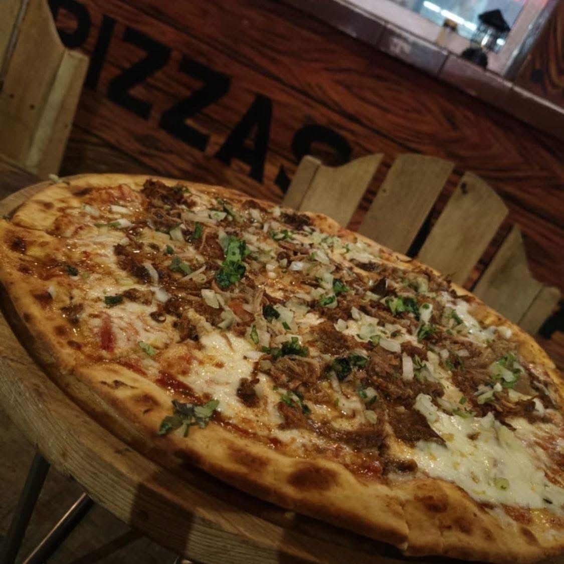Salsa especial, birria deshebrada, quesos Oaxaca y mozzarella, cebolla y cilantro. La quesabirria que fue al cielo y regresó en forma de pizza.