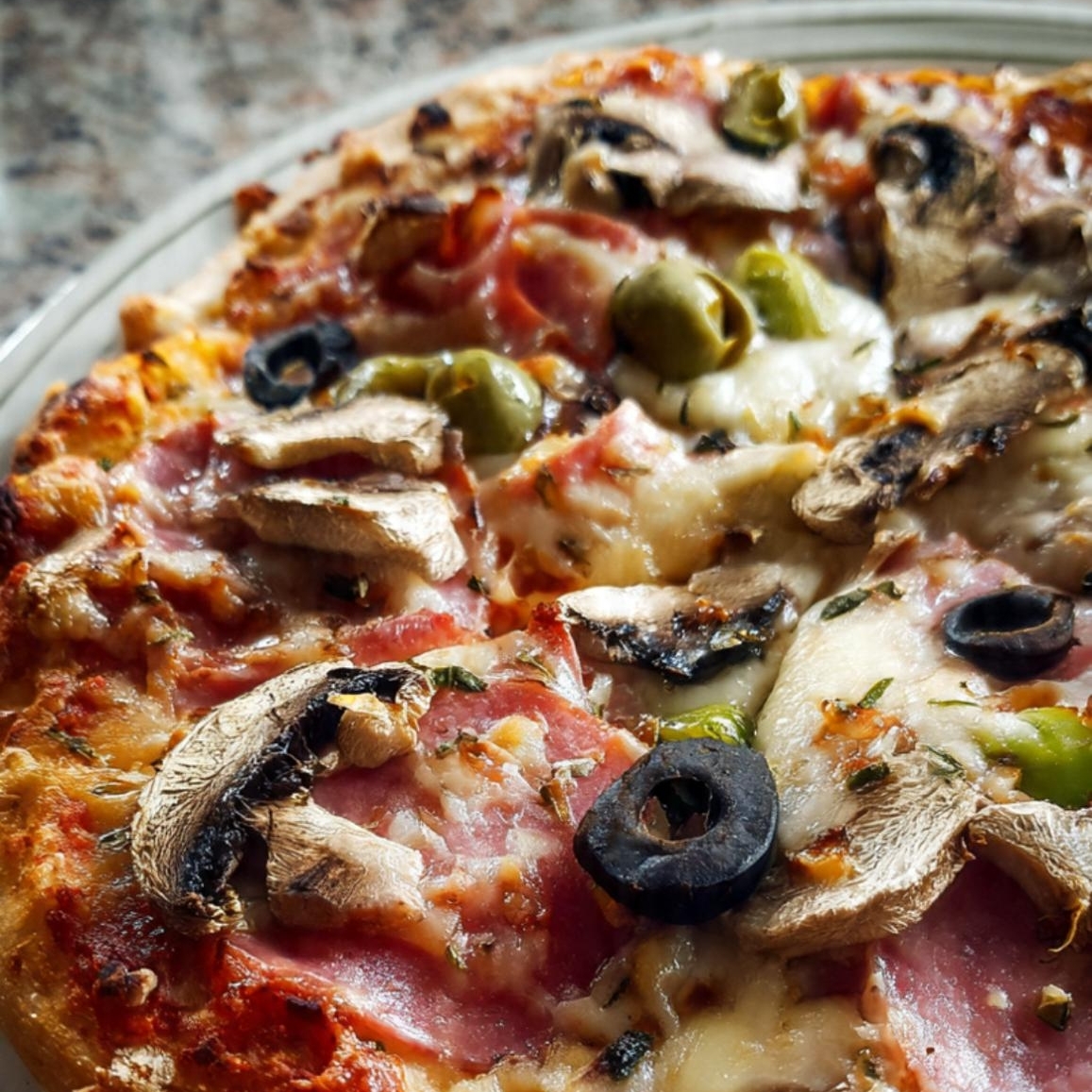 Champiñón, salami, jamón y aceituna mixta (negra y verde).