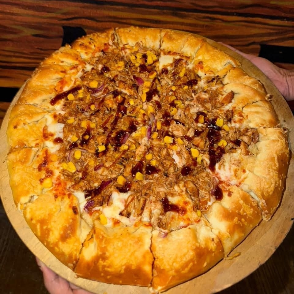 Salsa BBQ casera, pollo, cebolla caramelizada, elote y mezcla de quesos. Un río de sabor en familia en cada mordida.