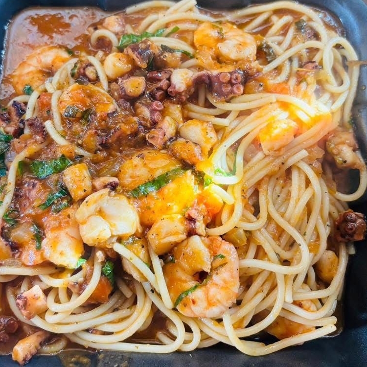 Mariscos salteados, con un toque de chile quebrado y base de salsa de tomate con especias