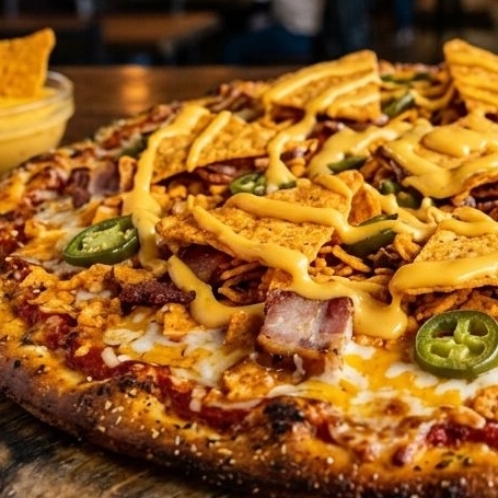 Doritos, jalapeño, tocino, Doritos molidos y una orilla rellena de mozzarella y cheddar. ¡Una bestia crujiente que ruge con sabor!