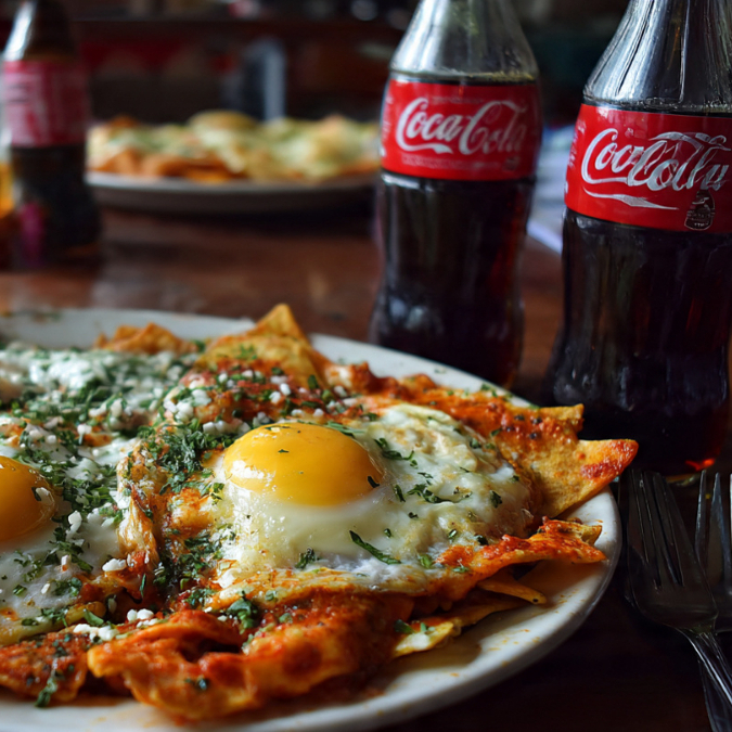 CHILAQUILES ROJOS CON CREMA Y QUESO Y DOS HUEVOS CON DOS COCAS