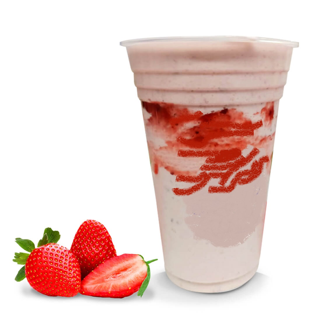 leche, hielo, fresas, salsa de fresa con crema