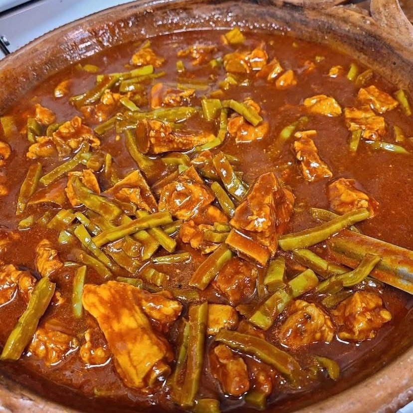 Costillitas de puerco con nopales y chile colorado. Nuestros guisos por lo regular están a una temperatura ambiente, indícanos en los comentarios si deseas que se te envié CALIENTE EL GUISO O GUARNICION.