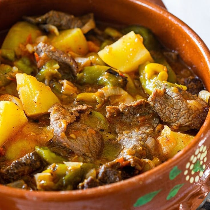 Bistec Ranchero de res con papas y verduras como chile, cebolla y tomate.