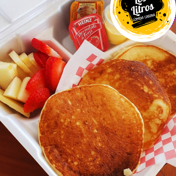 3 piezas de hot cakes sencillos, incluye miel maple, mantequilla y lechera.