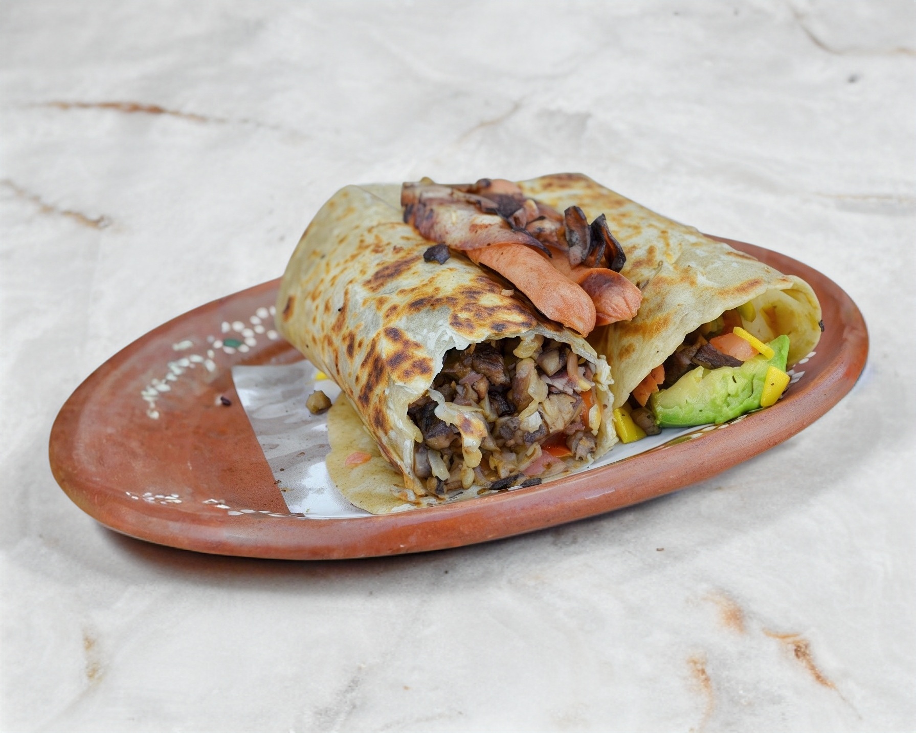 130 gramos de carne deshebrada salsa roja con tómate cebolla asada y lechuga mostaza chile crema y capsu