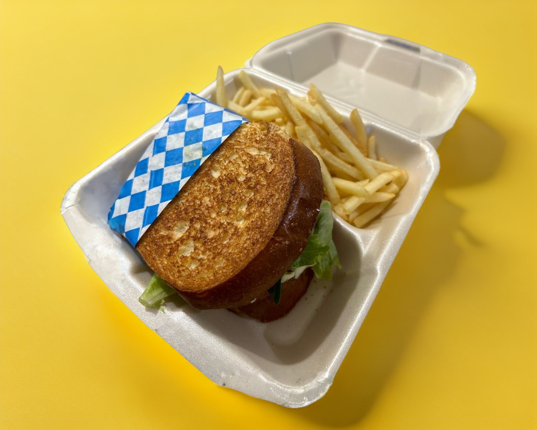 Pollo a la plancha, queso chihuahua, lechuga, tomate y aguacate. Acompañado con papas fritas.