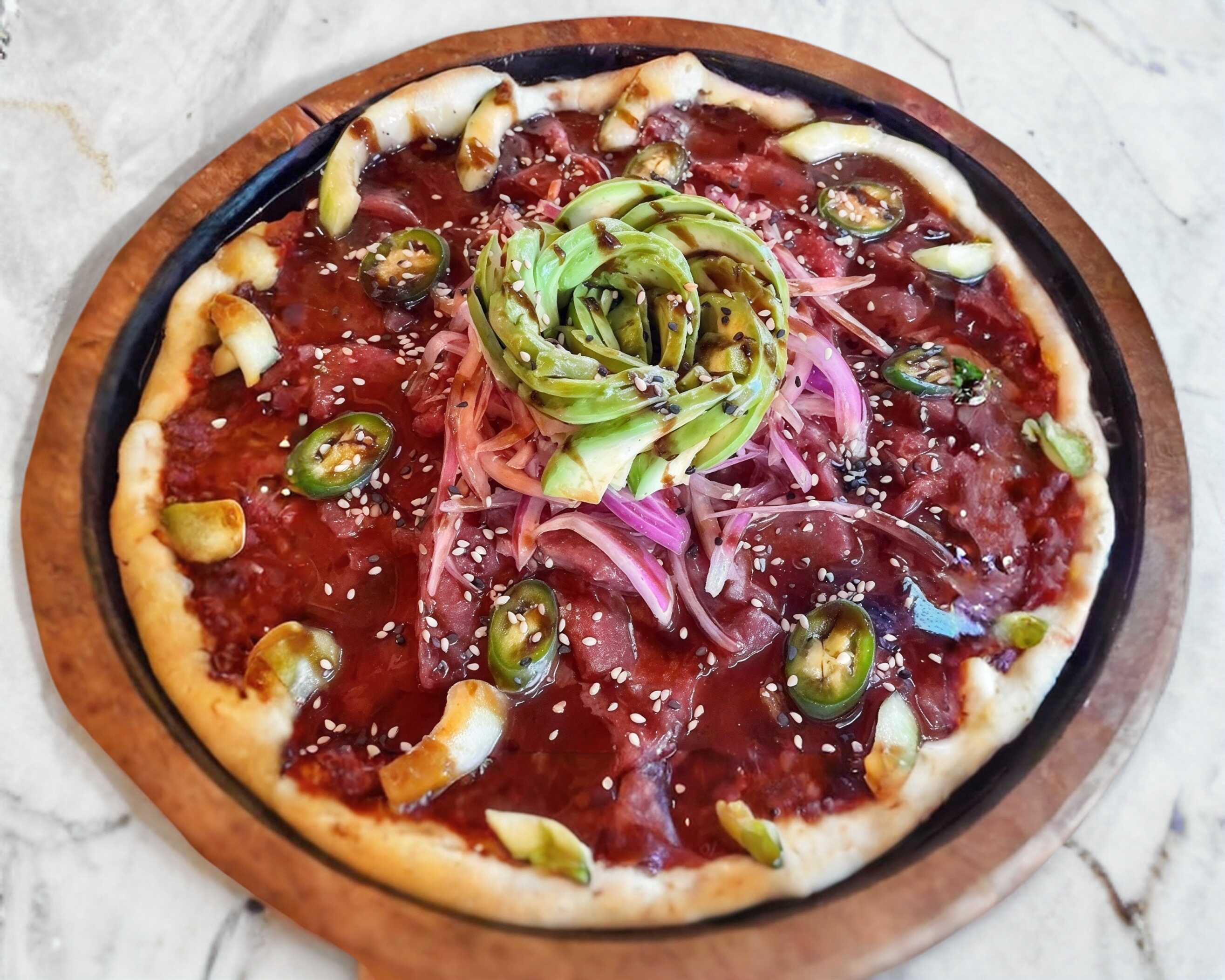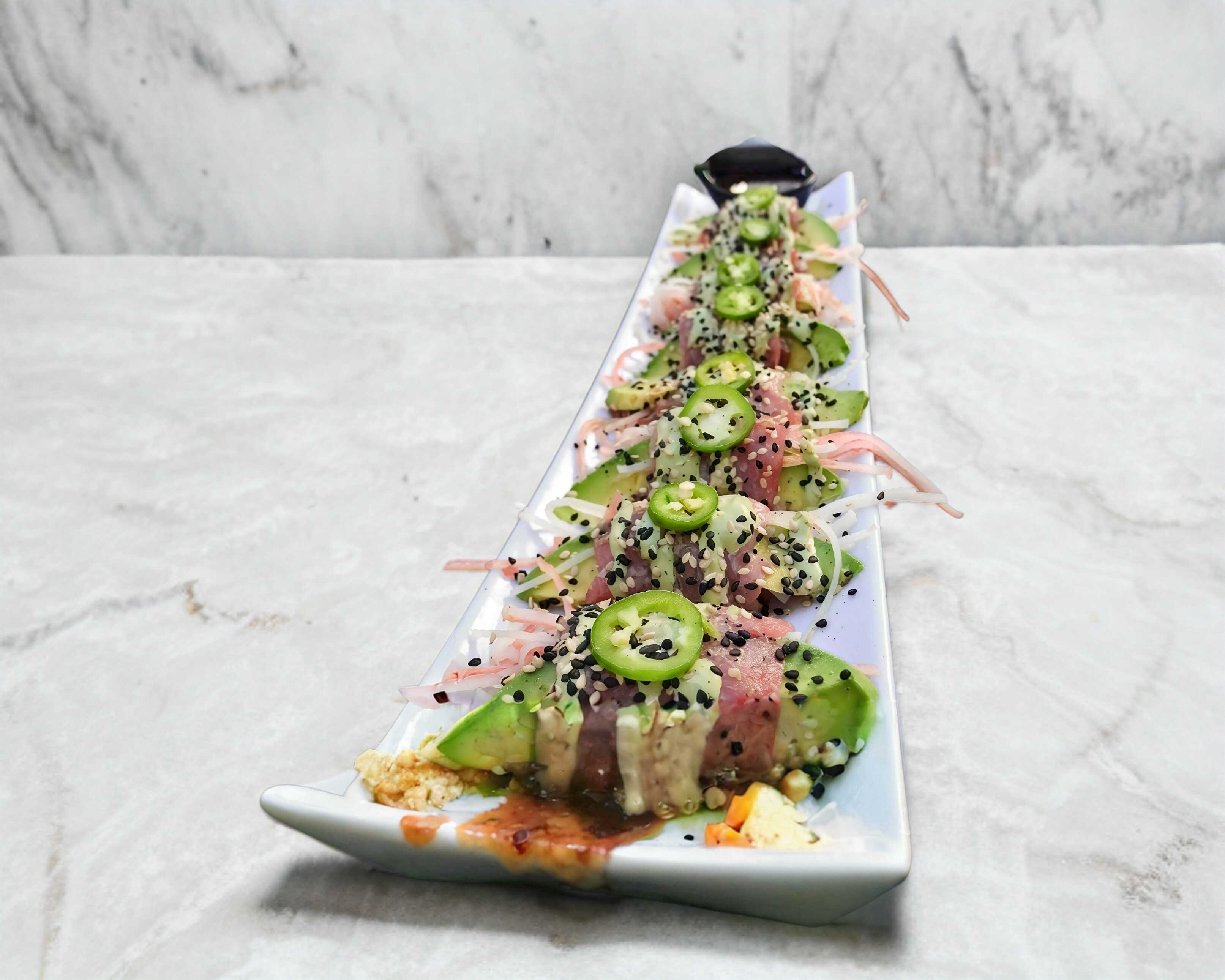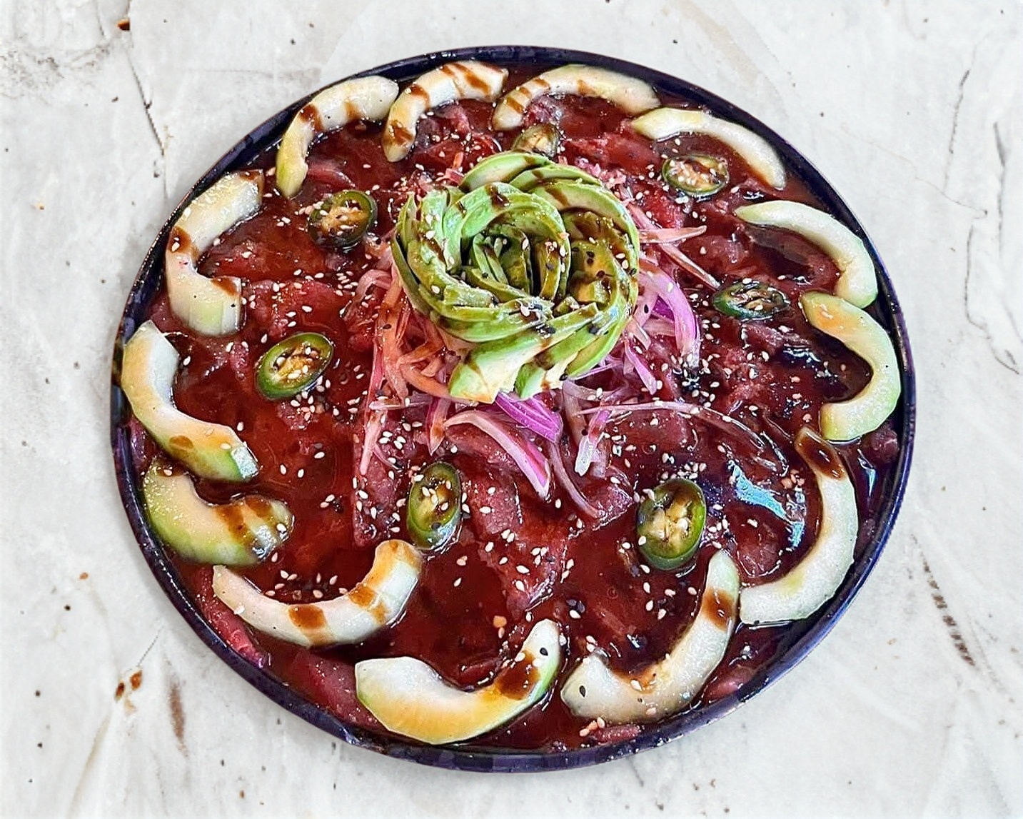 CAMA DE AGUACATE, LÁMINAS DE CAMARÓN CRUDO Y COCIDO, PESCA DEL DÍA (ATÚN), PULPO, CALLITO, CEBOLLA,SERRANO, ACEITE DE AJONJOLÍ Y SALSA DE LA CASA