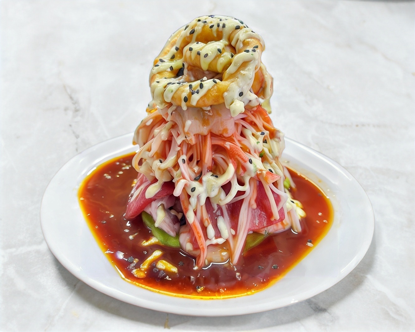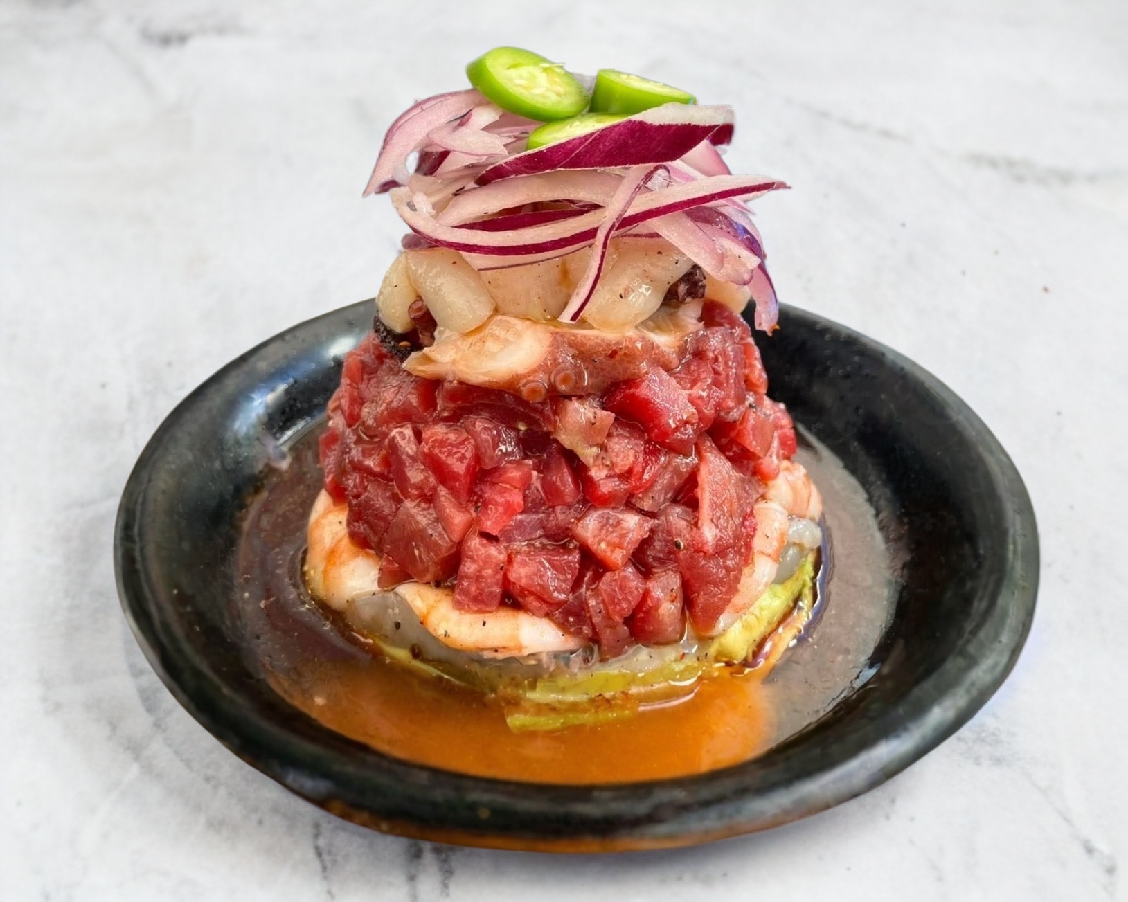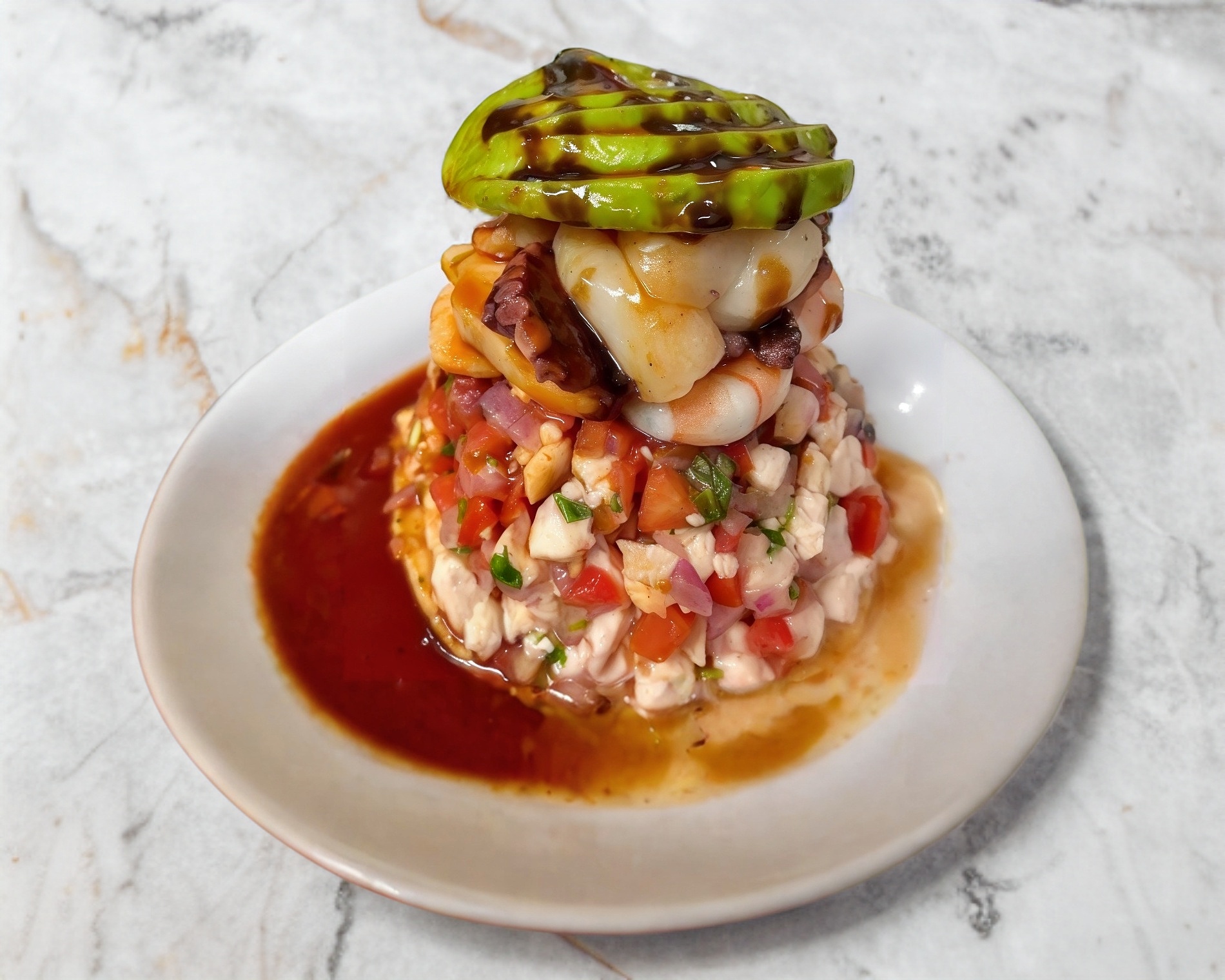 TORRE DE CEVICHE DE PESCADO, MARISCOS, PESCA DEL DIA, CAMARONES EMPANIZADOS BAÑADOS EN ADEREZO DE CHIPOTLE, PEPINO, CEBOLLA Y AGUACATE BAÑADA EN SALSA DE LA CASA