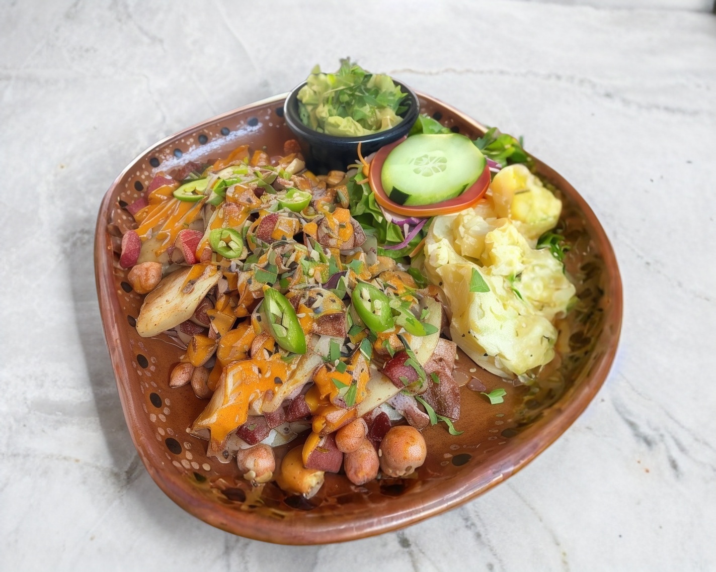 QUESADILLA CON GUISO DE CAMARÓN, ATÚN Y TOCINO ACOMPAÑADOS DE ENSALADA FRESCA, ENSALADA DE PAPA Y ARROZ