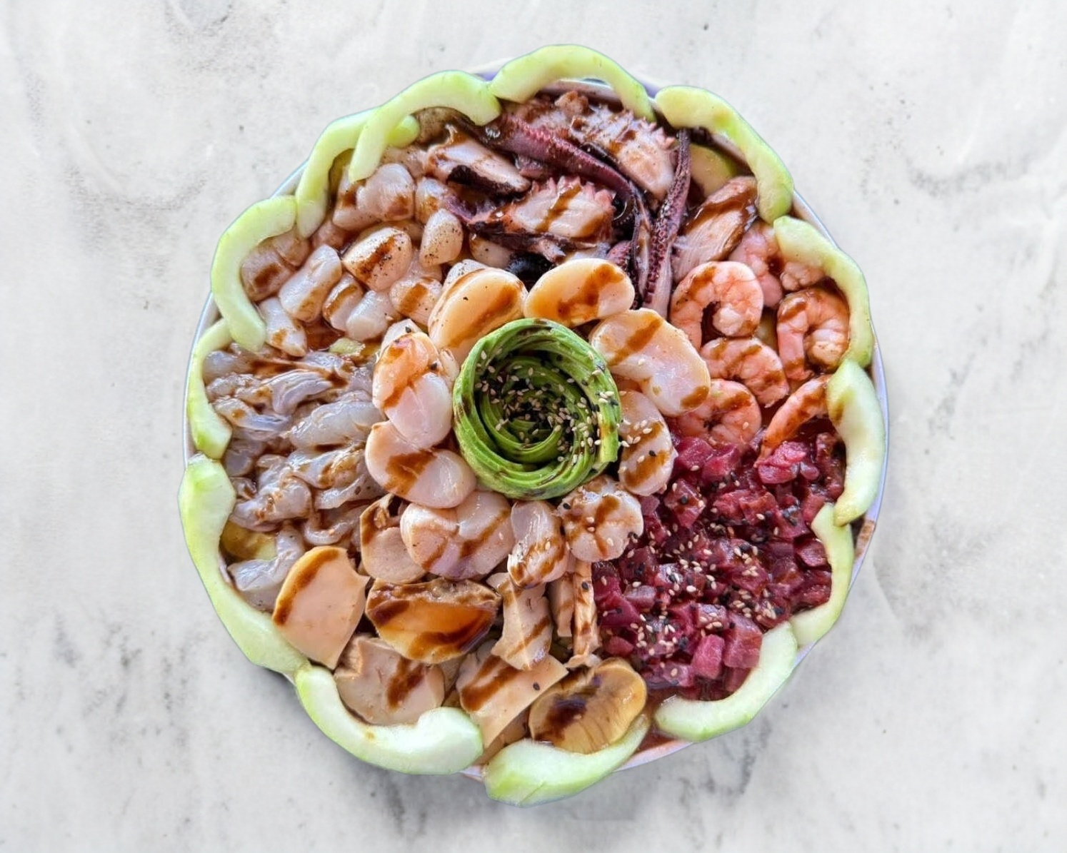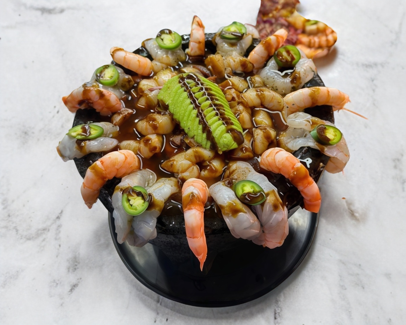 PESCA DEL DÍA (ATÚN), PULPO, CAMARÓN CRUDO Y COCIDO, CALLITO, CARACOL, CEBOLLA, CILANTRO, AGUACATE, SERRANO Y ACEITE DE AJONJOLÍ BAÑADA EN SALSA DE LA CASA