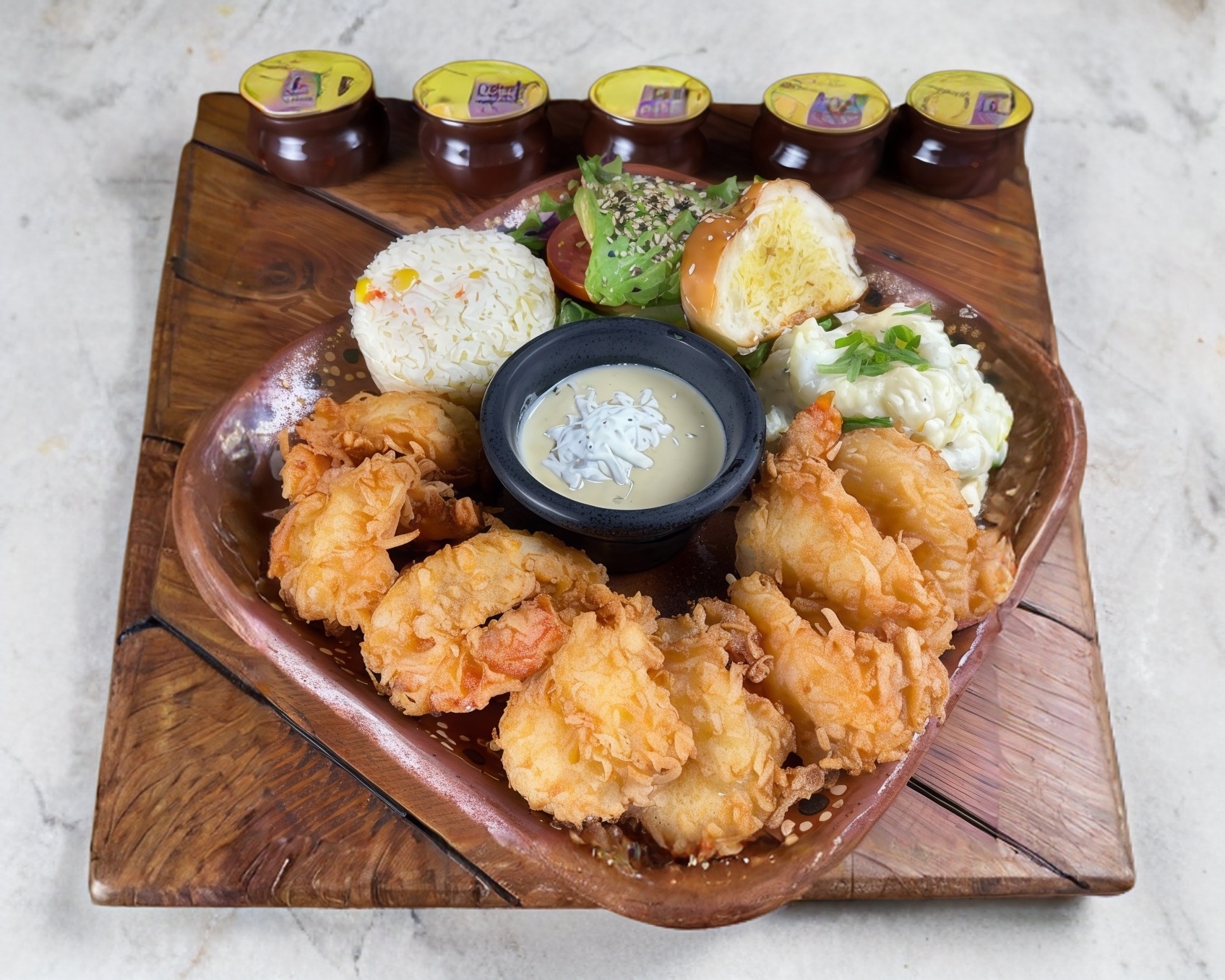 3 CAMARONES AL COCO, 3 EMPANIZADOS Y 2 ENTOCINADOS ACOMPAÑADOS DE ENSALADA FRESCA, ENSALADA DE PAPA Y ARROZ