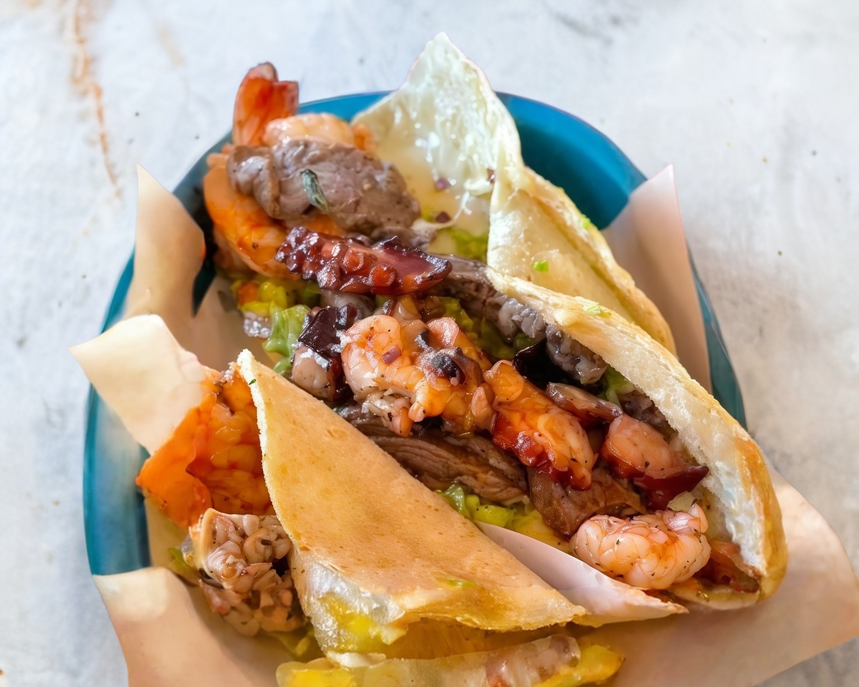 QUESADILLA DE ARRACHERA, CAMARÓN Y PULPO A LA PLANCHA CON GUACAMOLE