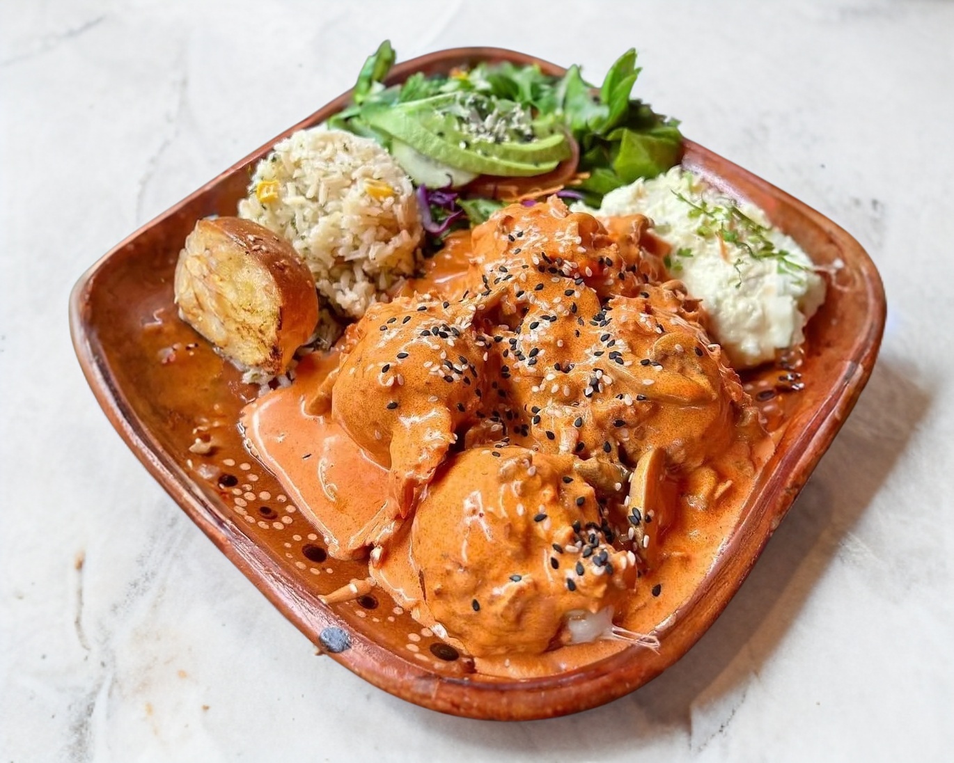 CAMATONES BAÑADOS EN SALSA DIABLA CON CHAMPIÑONES ACOMPAÑADA DE GUARNICIONES (ENSALADA DE PAPA, ENSALADA VFRESCA Y ARROZ)