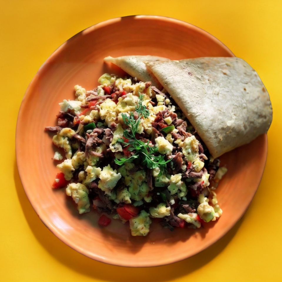 2 HUEVOS REVUELTOS, MACHACA DE RES, CEBOLLA, SERRANO, ACOMPAÑADO DE FRIJOLES, TORTILLAS Y SALSA