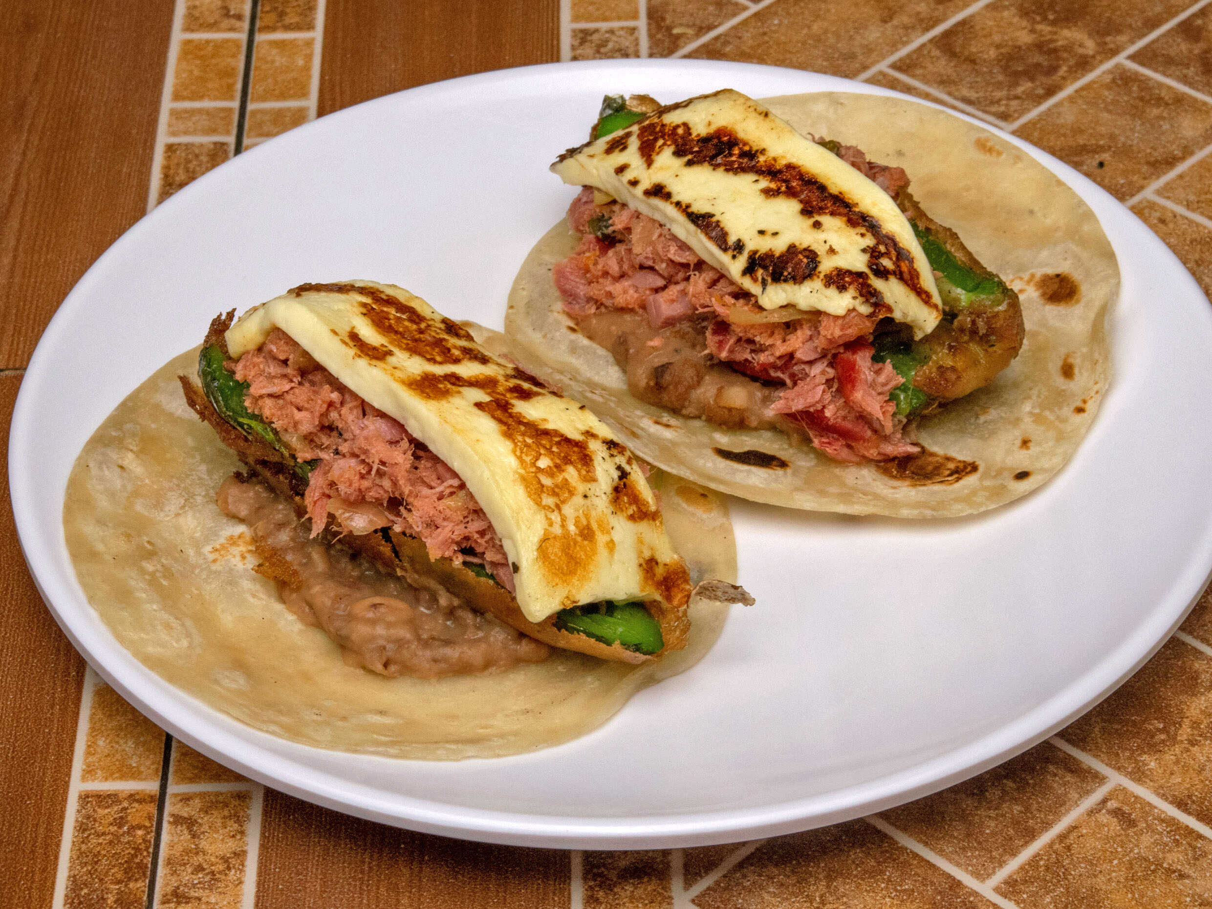 Tortilla de harina con frijol , jalapeño, marlín ahumado y queso asada.