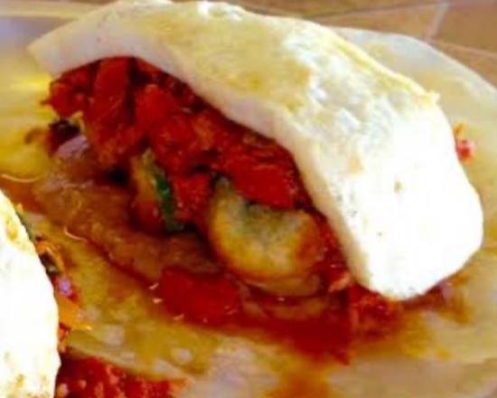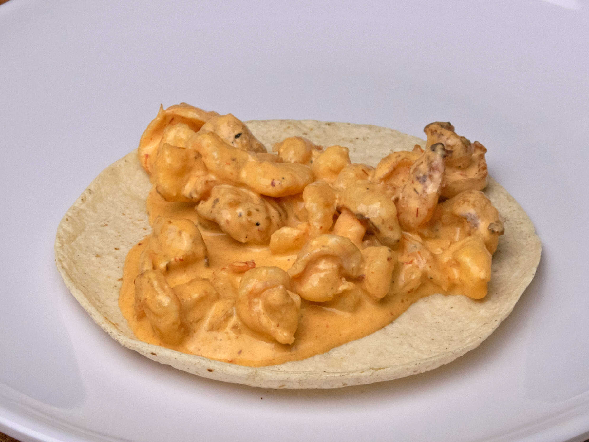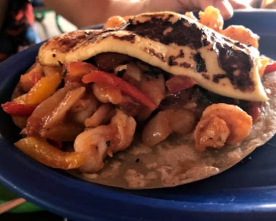 Tortilla de harina con camarón ranchero y queso asado.