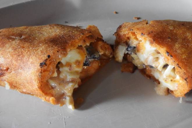 Empanada de Maseca rellena de pulpo al ajillo con queso.