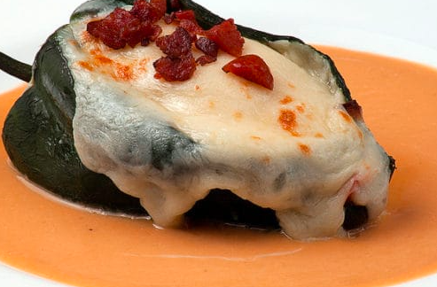 Chile relleno de camarón y pulpo a la diabla y queso asadero.