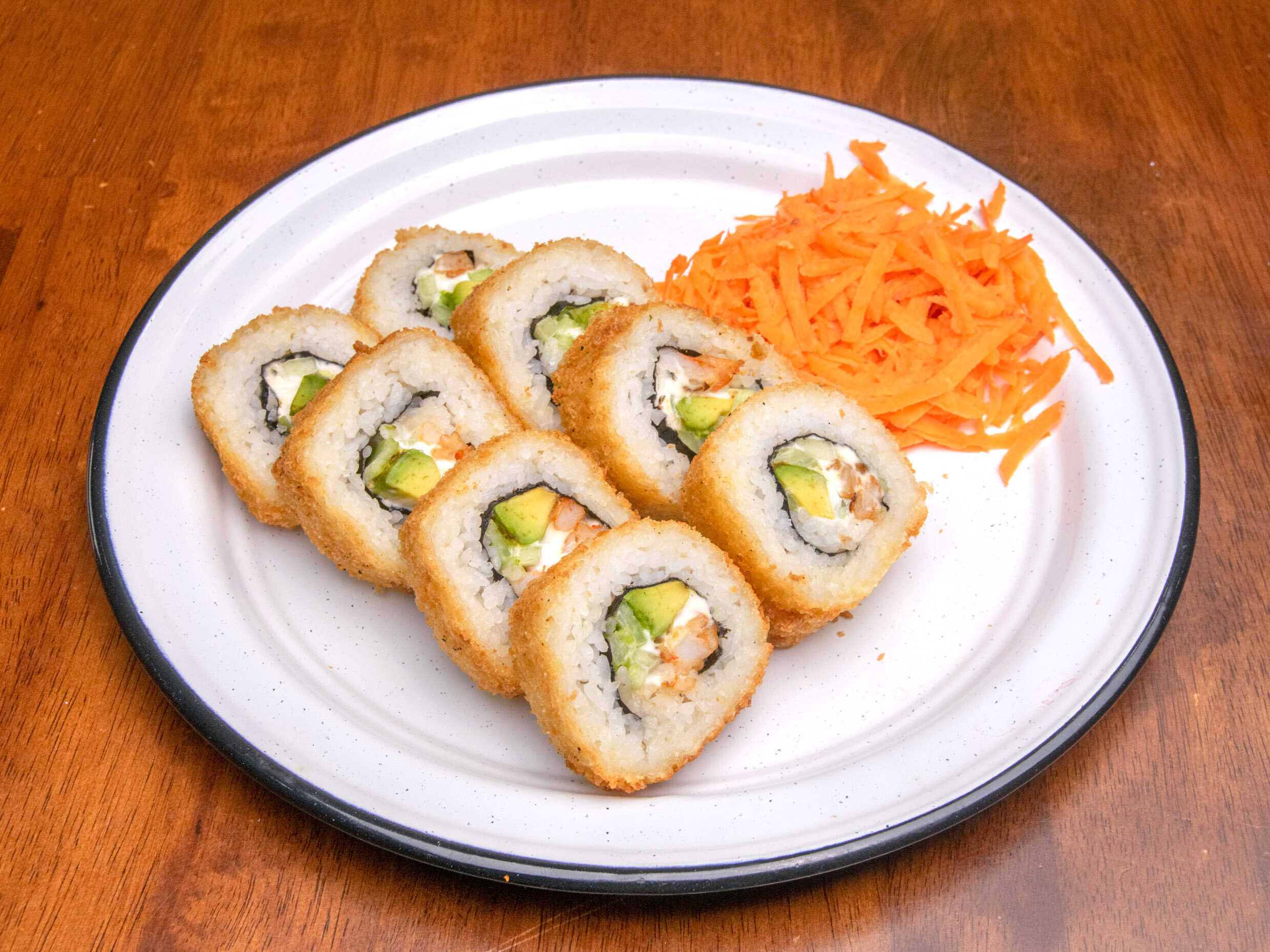 Por dentro Kanikama, pepino aguacate, queso crema Por fuera topping camarón tempura agridulce *alga por fuera al tempura
