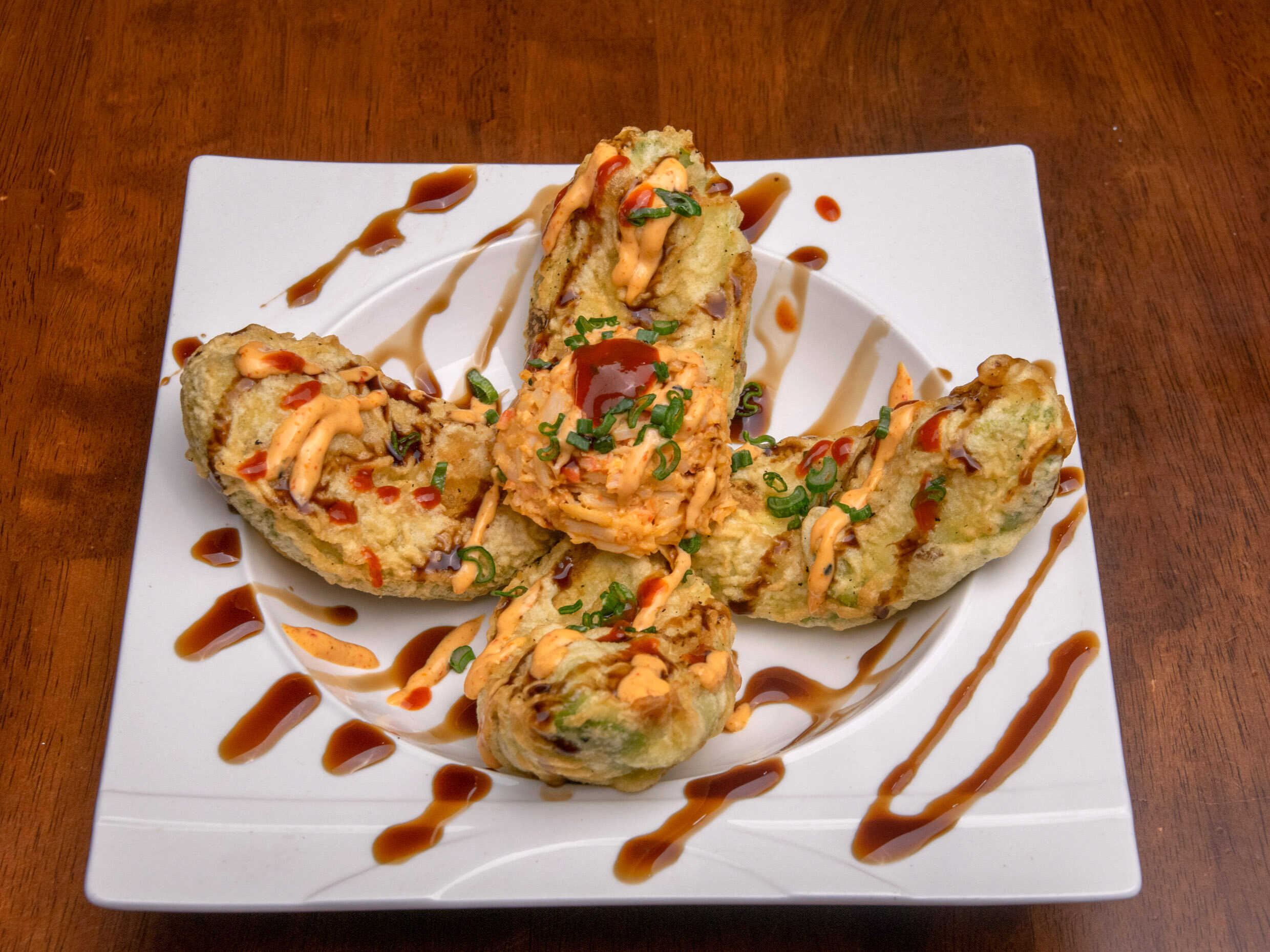 Chiles jalapeños rellenos de kanikama, fritos en tempura, acompañados con aderezo de la casa.